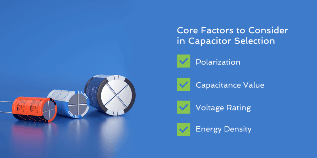 Generally, you will want to assess polarization, capacitance, voltage, and energy density as the core considerations for capacitor selection.