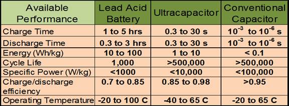 Ultracapacitor Performance vs. Battery/Conventional Capacitor Performance