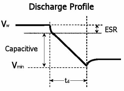 After the initial voltage drop due to ESR, the capacitor will discharge according to its capacitance and discharge current, as indicated by the following equation: dVcap= I * td/C