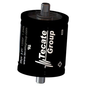 Large cylindrical ultracapacitor cells, screw terminals. Extremely low ESR, high power densitiy, high reliability.